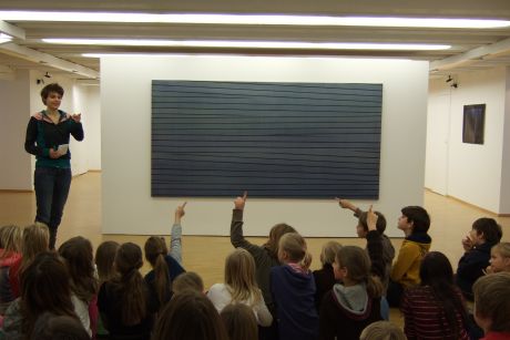 Zwei Klassen wurden jeweils parallel durch die Ausstellung geführt. Eine Bildbesprechung fand anschließend gemeinsam statt. Nach Frühstück und Tobepause malten die Kinder dann ihre eigenen, von der Bildbesprechung inspirierten Bilder. Außerdem gestalteten alle Kinder der neun Klassen eine gemeinsame großflächige Collage. Die Collage soll in der Pausenhalle der Grundschule aufgehängt werden.